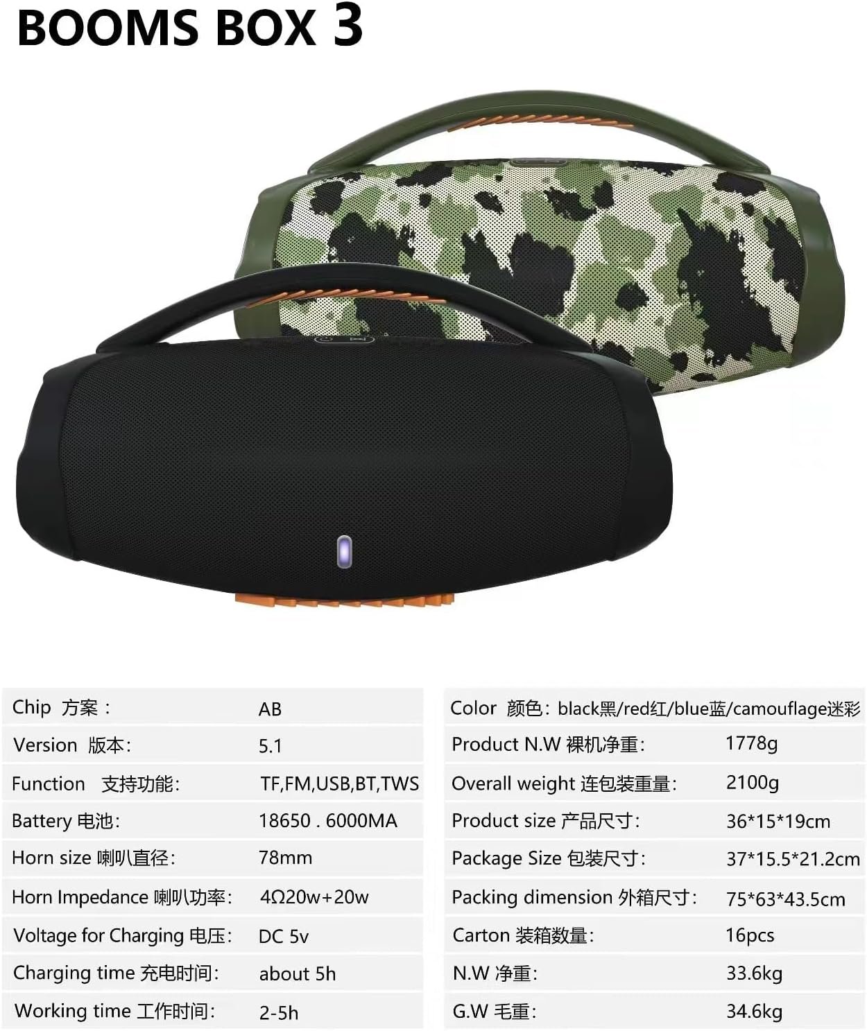 مكبر صوت بومز بوكس 3، مضخم صوت لاسلكي بلوتوث مقاوم للماء بصوت قوي، يدعم منفذ AUX/USB/بطاقة TF/راديو/بلوتوث (تصميم مموه)